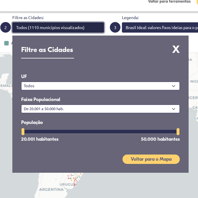 A ferramenta foi construída para permitir uma análise visual na exploração do território e análises aprofundadas em estados específicos e municípios com mesma faixa populacional.