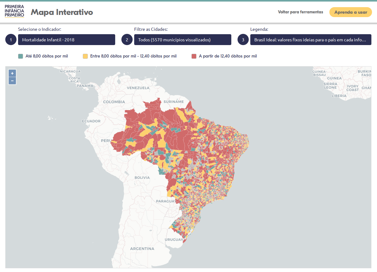 O mapa apresenta indicadores de diversas áreas como saúde e educação, promovendo uma visão intersetorial do cenário da primeira infância.