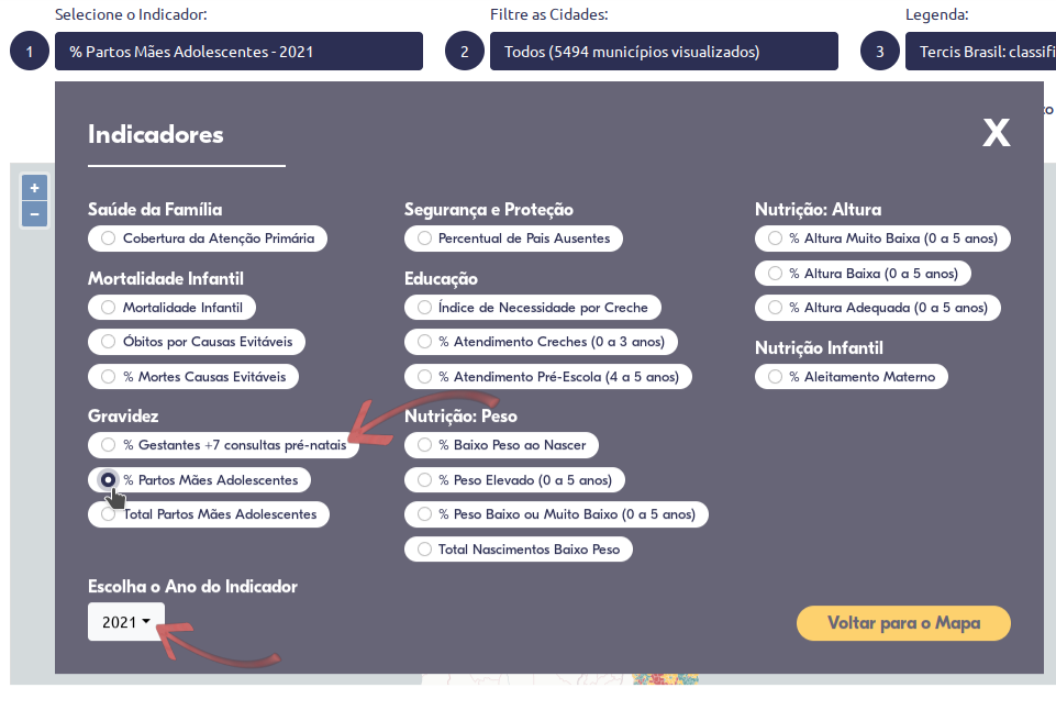 Nosso primeiro passo é escolher o indicador que iremos analisar. Como exemplo, escolheremos o "Percentual de Partos de Mães Adolescentes" que inclui o percentual do total de partos na cidade por mulheres com idade até 19 anos completos.