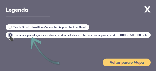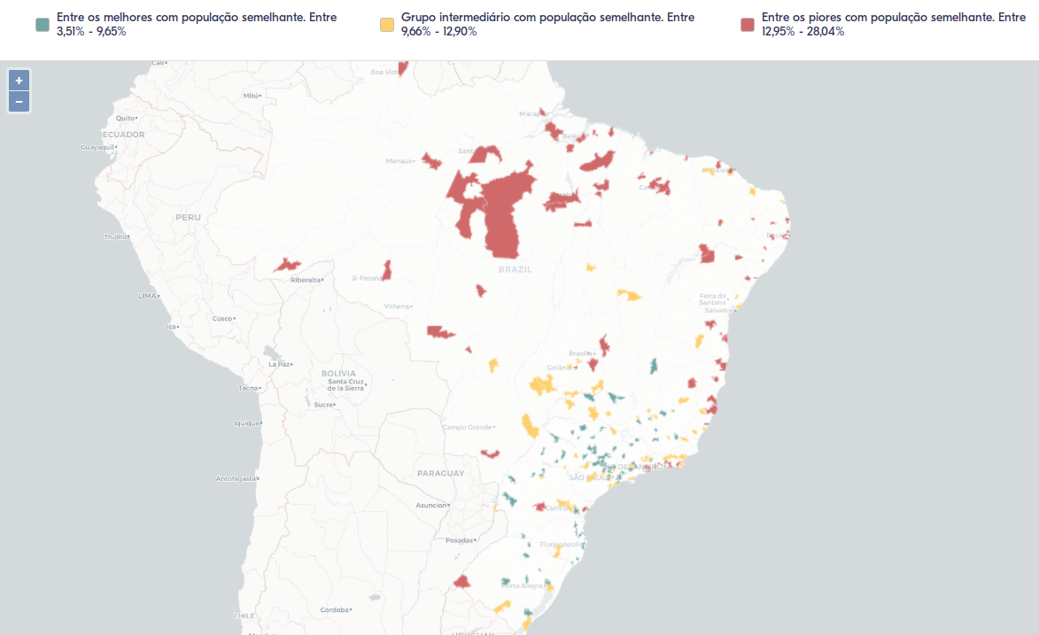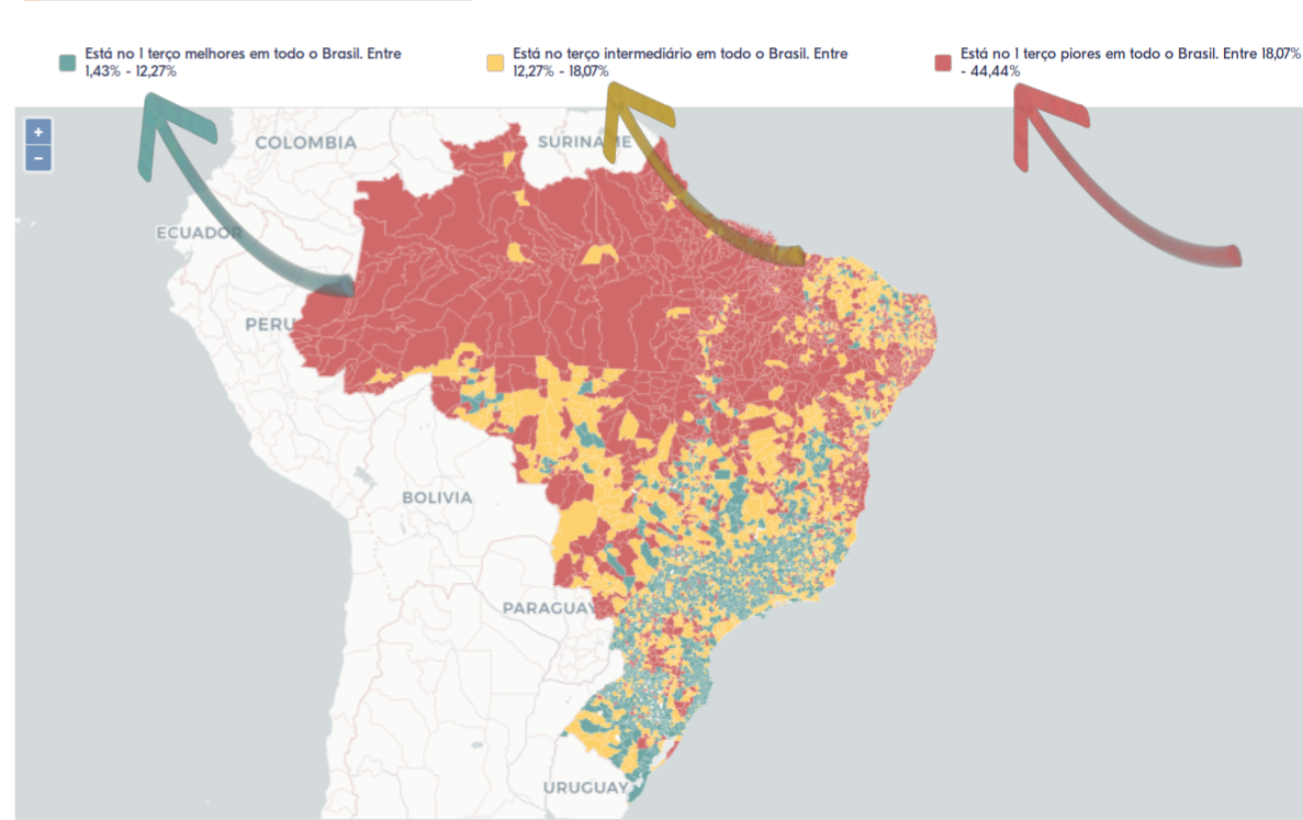Existem diferentes formas de calcular se um indicador é considerado melhor ou pior. No mapa interativo, a legenda inicial é a "Tercis Brasil".