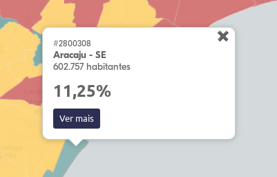 Para ver o valor do indicador de uma cidade específica, você pode clicar sobre a cidade e aparecerão as seguintes informações: o valor do indicador, o nome da cidade e o total de habitantes da cidade.