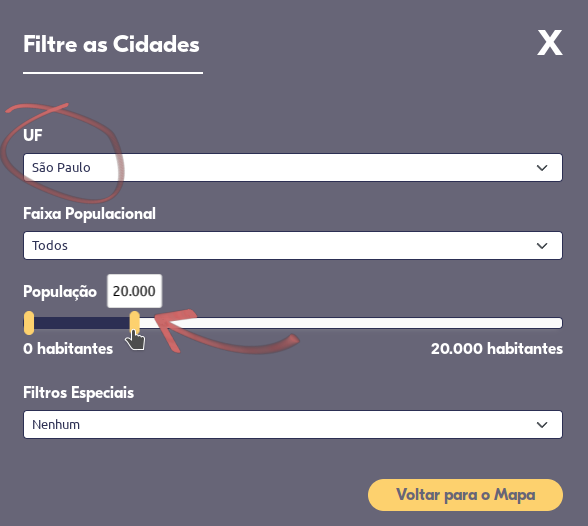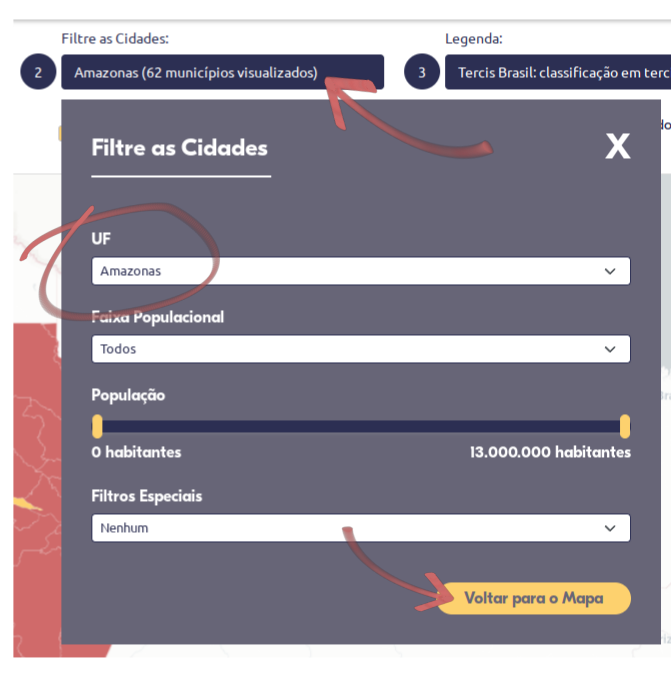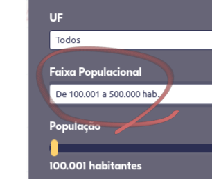 Para esta análise, clique no filtro de cidades e selecione a opção de filtro de faixa populacional de municípios de acordo com o valor desejado.