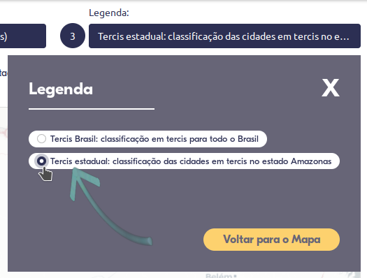 Uma nova opção de legenda aparecerá quando um estado for selecionado. É a legenda "tercis por estado" que permitirá ver o estado selecionado dividido em três grupos: municípios em verde com melhor desempenho no indicador dentro do estado, municípios em amarelo com desempenho intermediário e municípios em vermelho com desempenho abaixo.