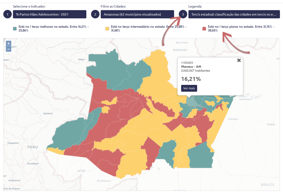 Esta ferramenta possui a possibilidade de comparar os municípios, estados e regiões em relação ao país em determinado indicador, como também permite a análise de um estado em separado, de modo a identificar territórios onde os indicadores apresentem melhores resultados dentro do estado. Para esta análise vamos utilizar o estado do Amazonas como exemplo e filtrar os municípios para somente municípios deste estado.