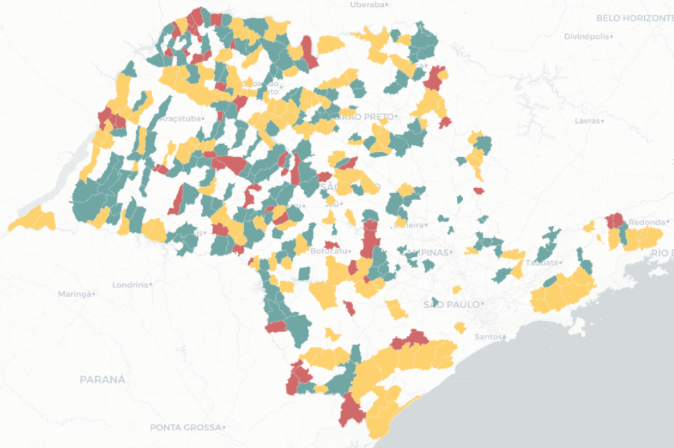 Cada município aparece com uma cor. Verde indica bom desempenho no indicador. Amarelo significa desempenho intermediário e vermelho um desempenho abaixo da média.