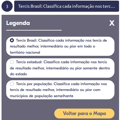 A legenda padrão é chamada "Tercis Brasil", que classifica se um indicador está melhor, intermediário ou abaixo dos demais, considerando a comparação com todos os municípios do Brasil.