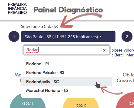 O foco do Diagnóstico por território é permitir a análise integrada dos diversos indicadores para um único município. Utilize o campo de busca para digitar parcialmente o nome da localidade desejada e clique sobre a mesma para selecioná-la.
