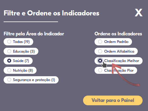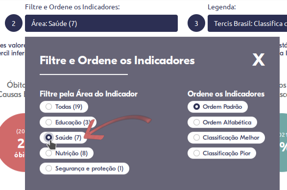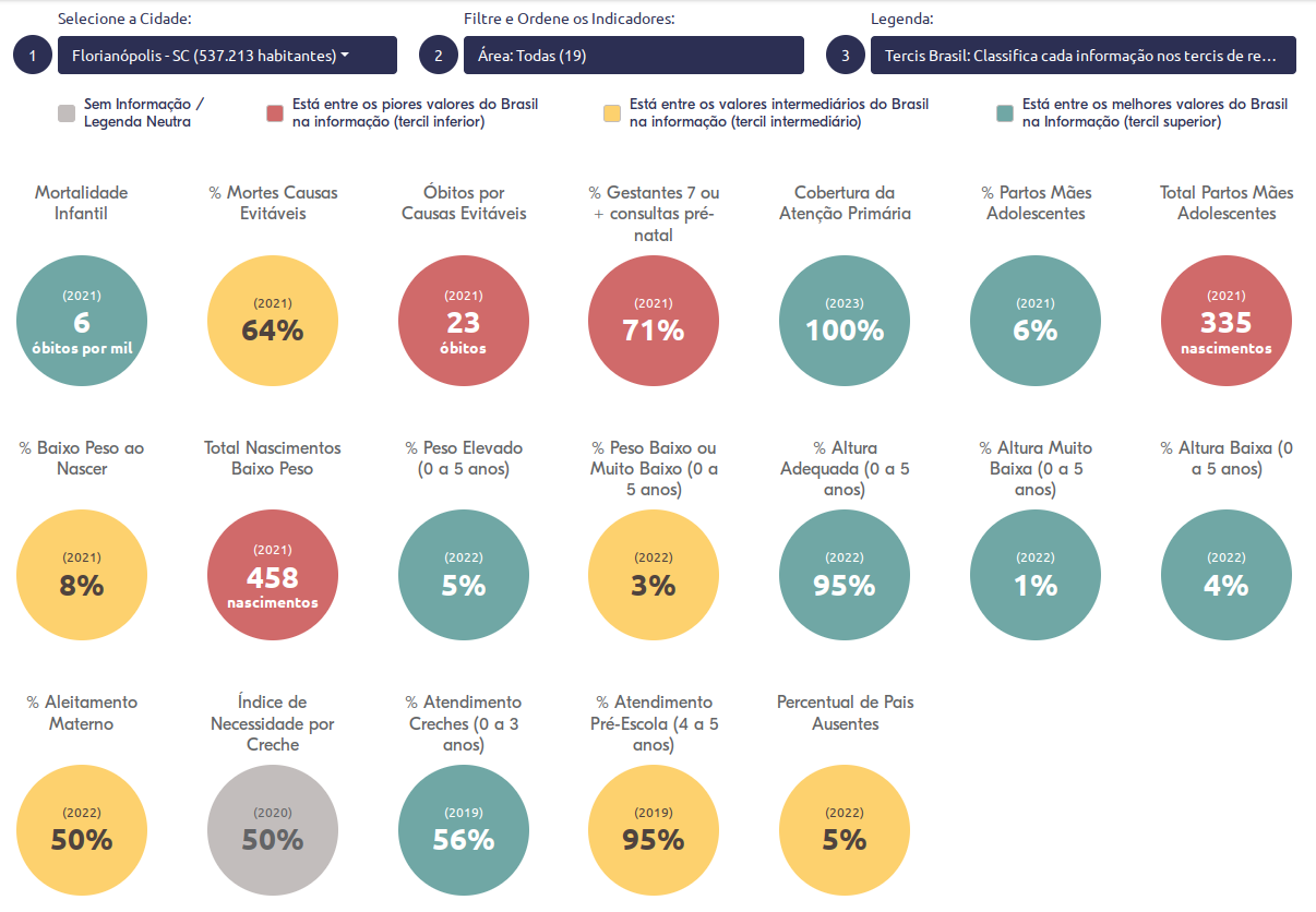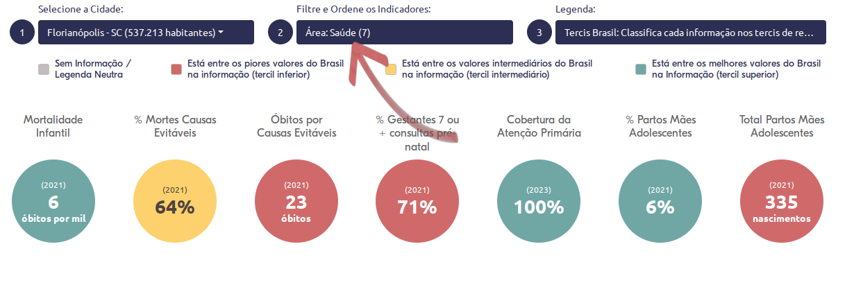 Para análises específicas, é possível filtrar os indicadores por uma área específica como saúde, educação ou nutrição.
