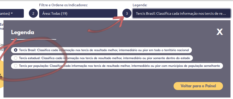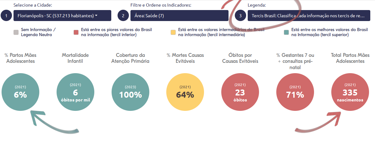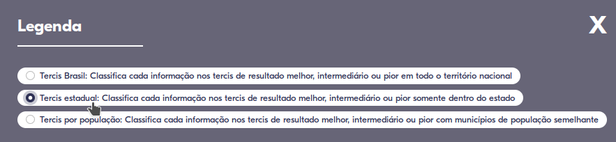 A definição das cores de destaque de cada indicador é feita conforme a opção de legenda selecionada. A escolha de uma legenda é uma maneira de escolher como comparar o município em relação à outros.