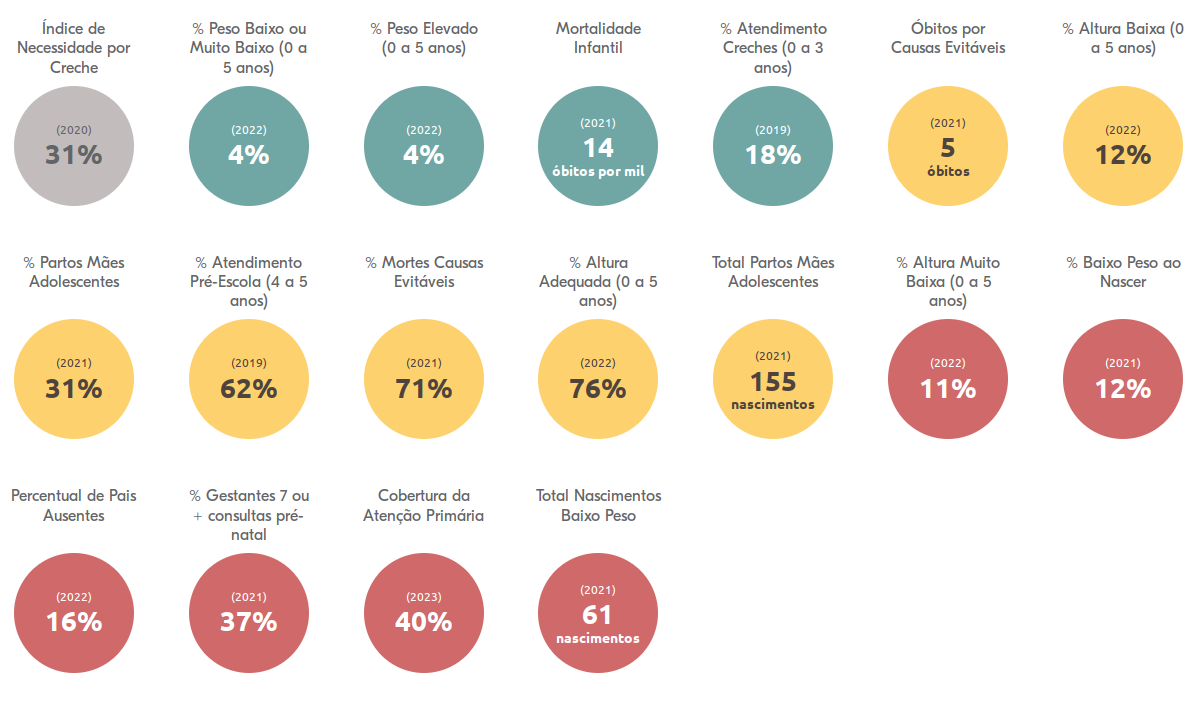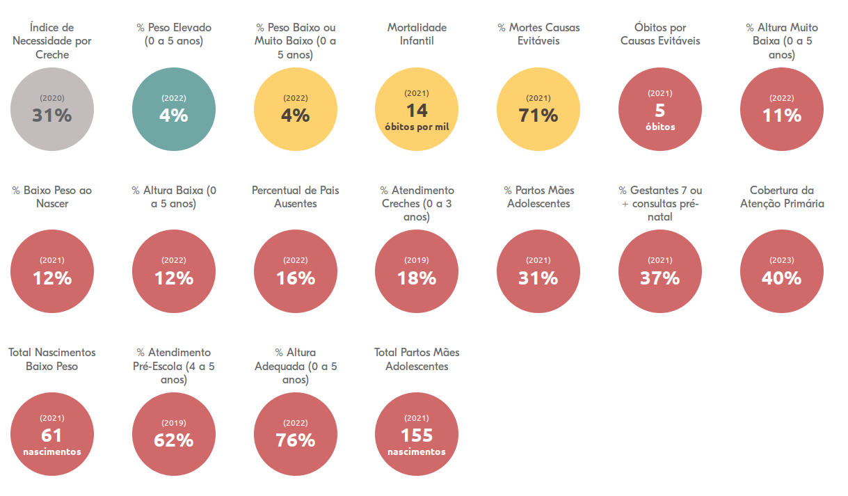 Nesta visão municipal e multidimensional, os indicadores de saúde, educação e outros temas estão lado a lado, favorecendo a compreensão dos pontos fortes e pontos de atenção na cidade.