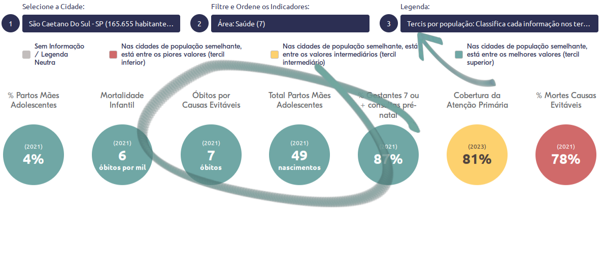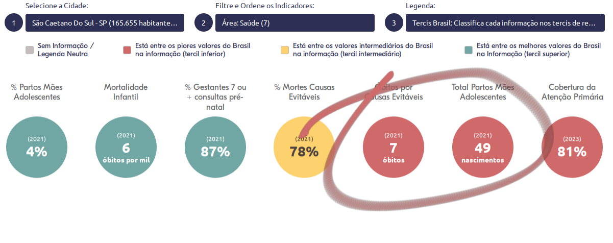 Como exemplo, ao compararmos os indicadores de saúde em São Caetano do Sul - SP com a legenda "Tercis Brasil" temos três indicadores classificados dentro do tercil mais baixo do país.